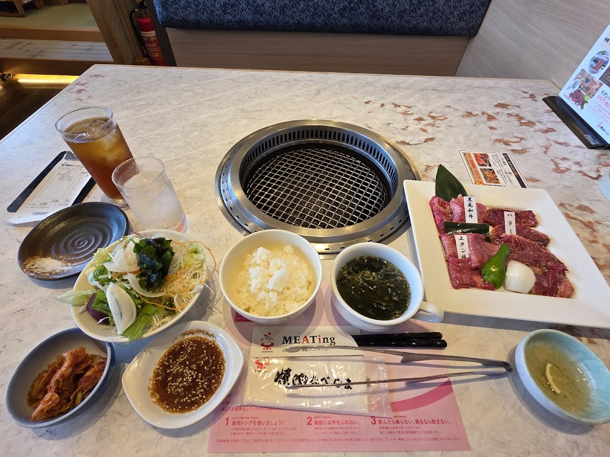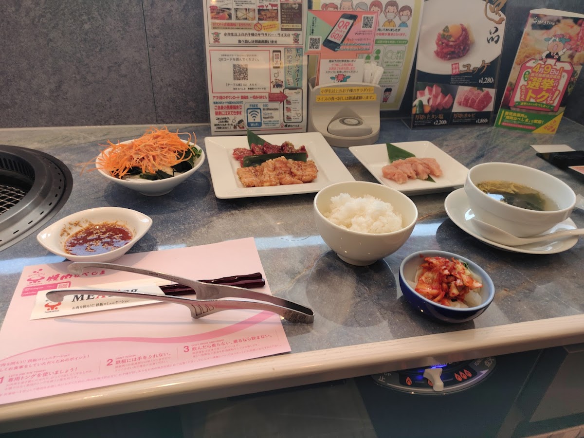 The menu is built around grilled meats done properly, and the lunch options are especially popular with locals. One standout is サガリランチにホルモンもう一品, which balances tender sagari beef with an extra serving of horumon that adds depth and richness to the meal. It feels generous and satisfying, perfect for anyone who wants variety without overthinking their order. The カルビ ランチメニュー is another reliable favorite, offering well-marbled short ribs that grill beautifully at the table, filling the space with an irresistible aroma.