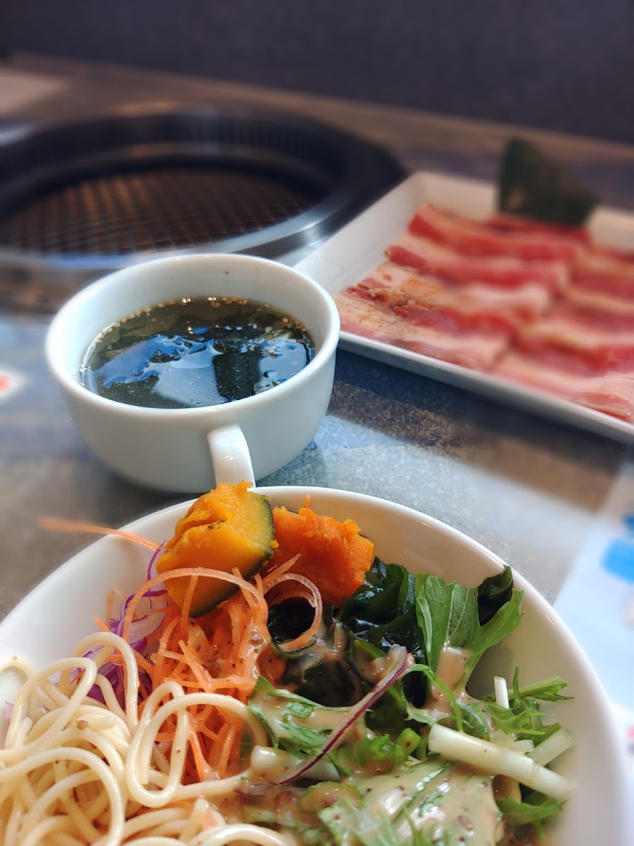 What makes the experience more rounded is the サラダバイキング. Fresh, crisp vegetables and simple dressings lighten the meal and make the menu feel well-balanced. Between bites of grilled meat, the salad bar keeps everything feeling fresh and unhurried. For those who enjoy a more refined texture, 焼きしゃぶ delivers thinly sliced beef that cooks quickly and stays delicate, highlighting the quality of the meat itself.